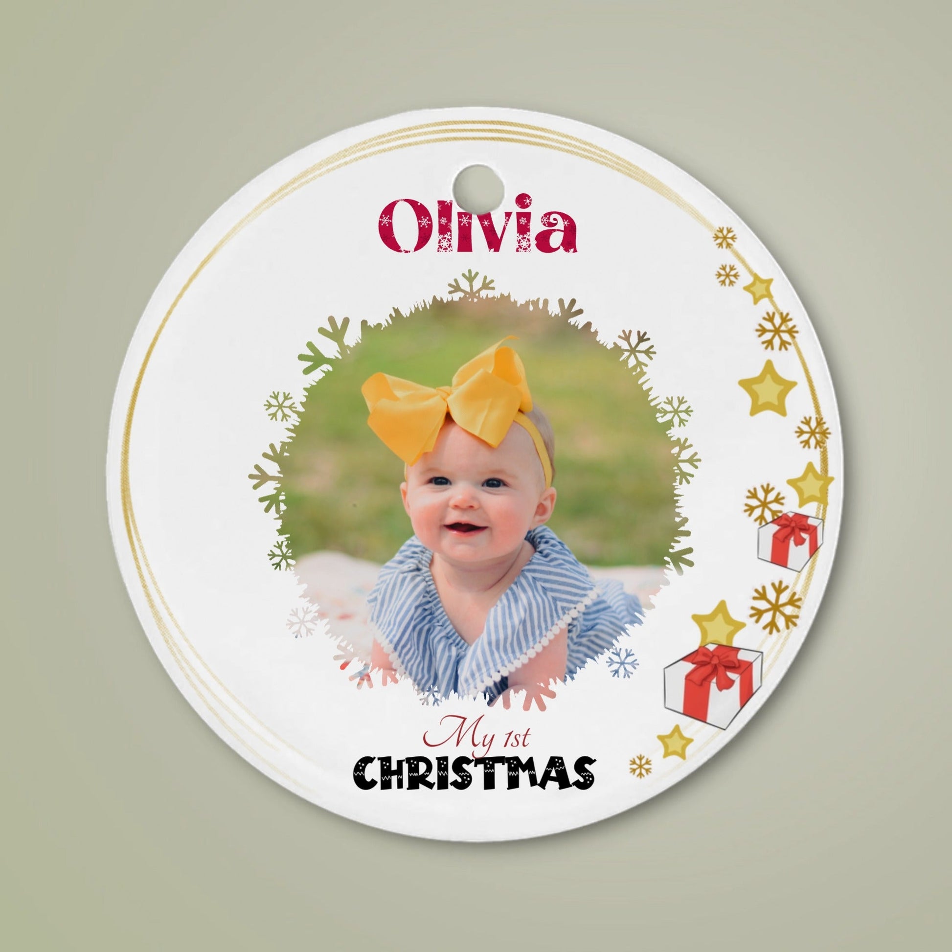 Celebrate your baby’s first Christmas with a timeless round ceramic ornament, personalized with your favorite photo, your child's name, and a choice of festive Christmas borders. The classic shape effortlessly complements both traditional and modern home decor styles. Whether displayed on your holiday tree, given as a thoughtful gift, or used as a stylish accent in your home, this ornament brings instant warmth and cheer to any setting.